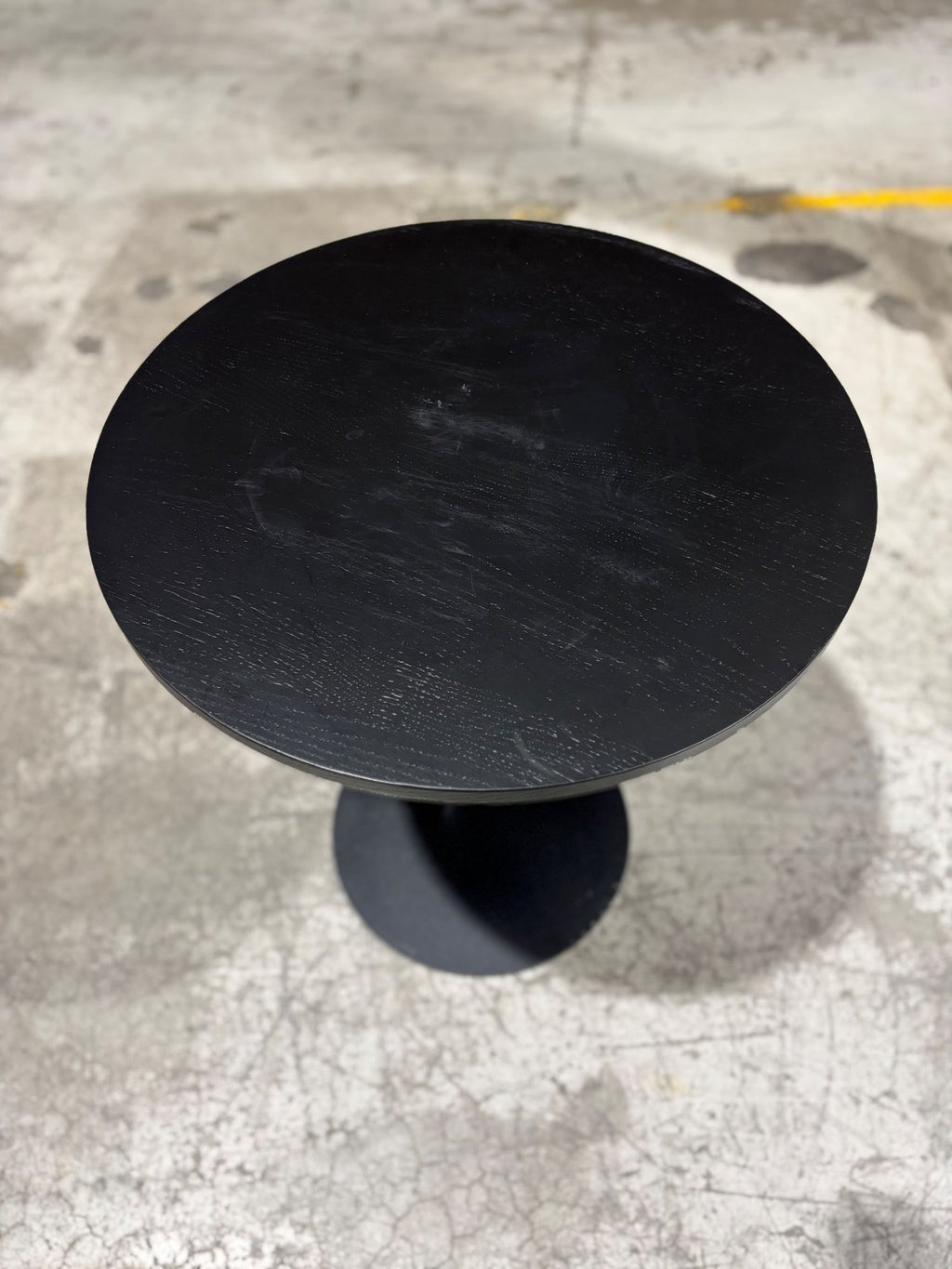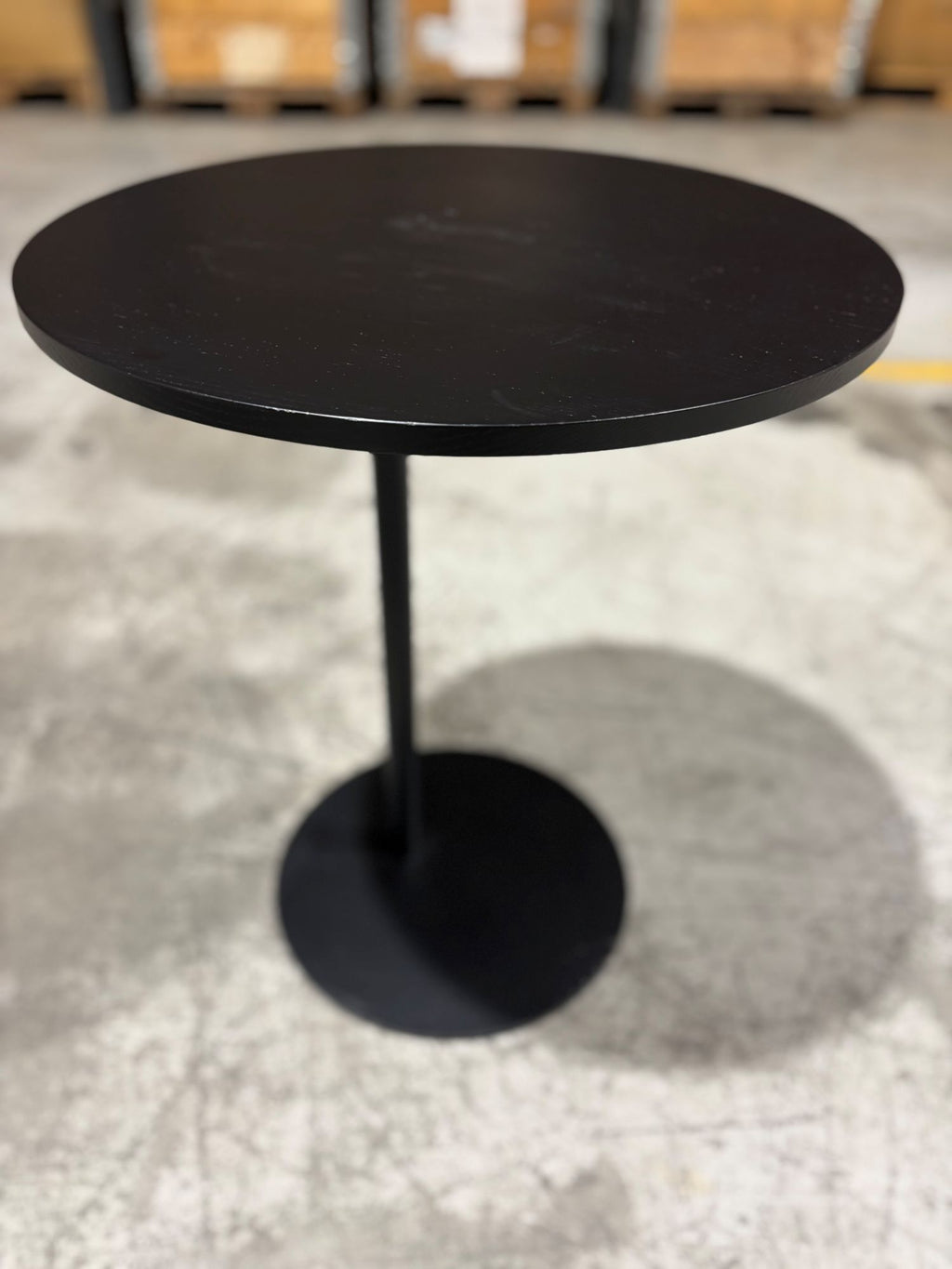 Plate sort treverk, understell sort metall. En del riper i bordplata